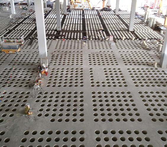 結(jié)構(gòu)留孔:作為模板,澆筑混凝土后形成均勻圓形孔洞,構(gòu)成奇氏板(華夫板) 結(jié)構(gòu)。